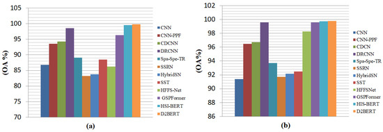 The second analysis relies upon the calculation of the OA and AA indexes for all the compared approaches, training them with 200 samples. The results are reported in Table 4, the classified maps achieved from the comparing methods are presented in Figure 3 and the OA graphs are presented in Figure 4. Among the compared methods on the Pavia University dataset, D2BERT achieves the highest OA and AA indexes, i.e., 99.79% and 99.68%, respectively. The gap in performance is clear with respect to CNN, Spa-Spe-TR, SSRN, HybridSN, and SST, with improvements in the range from 6.07% to 8.38%. D2BERT achieves the same remarkable level of accuracy as DRCNN, HSI-BERT, HFFSNet, and GSPFormer. These results point out the superiority of D2BERT in accurately classifying the Pavia University data. Focusing on the Indian Pine dataset, D2BERT achieves very high values of the OA and AA indexes, i.e., 99.76% and 99.68%, respectively, obtaining the top scores among the compared approaches. The comparison of the classification maps also shows the superiority of D2BERT. These experiments demonstrate that D2BERT achieves state-of-the-art classification performance on two benchmark datasets compared to recent CNN, transformer, and BERT-based methods.