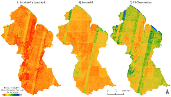 - Flores-Anderson, A.I.; Cardille, J.; Azad, K.; Cherrington, E.; Zhang, Y.; Wilson, S. Spatial and temporal availability of Cloud-free Optical Observations in the tropics to Monitor Deforestation. Sci. Data 2023, 10, 550. [Google Scholar] [CrossRef]