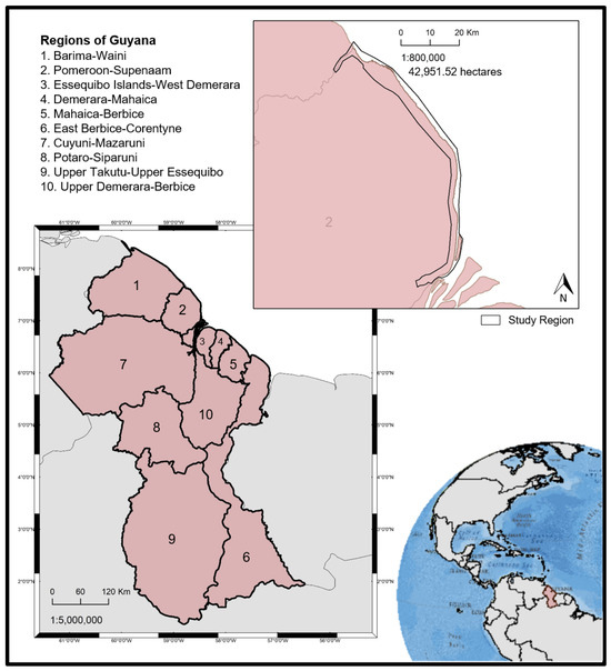 Guyana consists of 6 coastal regions: Barima-Waini (Region 1), Pomeroon-Supenaam (Region 2), Essequibo Islands-West Demerara (Region 3), Demerara-Mahaica (Region 4), Mahaica-Berbice (Region 5), and East Berbice-Corentyne (Region 6). Our study area in Pomeroon-Supenaam (Region-2) is approximately 6195 km2 and is bounded by the Atlantic Ocean to the north, the Pomeroon River Estuary to the west, the Essequibo River Estuary to the east, and extends all the way to the Supenaam River to the south (Figure 2) [41]. This region is of interest given that NAREI began mangrove restoration efforts in this region in 2013.