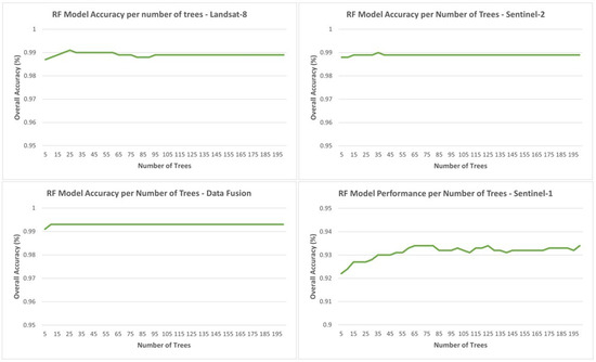 To determine the optimal number of trees with which to parameterize the random forest classification model for each dataset, hyperparameter tuning was conducted. Hyperparameter tuning can result in statistically significant improvements in supervised classification model performance [64]. In this case, every RF classifier was trained with a range of 5 to 200 decision trees in increments of 5 to determine the number of trees that leads to the greatest accuracy for the least amount of computational power. The accuracy of model performance for each iteration was graphed (Figure 4). Notably, Sentinel-1 (C) had a lower overall accuracy than other model iterations, and an adjusted y-axis range was used accordingly.