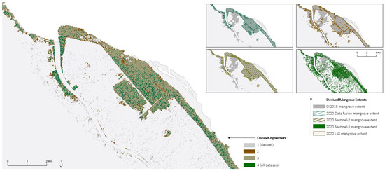 Mangrove extent map comparison for the study area based on Landsat-8, Sentinel-2, Sentinel-1 data, and data fusion. (Larger) Mangrove extent agreement between all datasets (Smaller); separated mangrove extents.