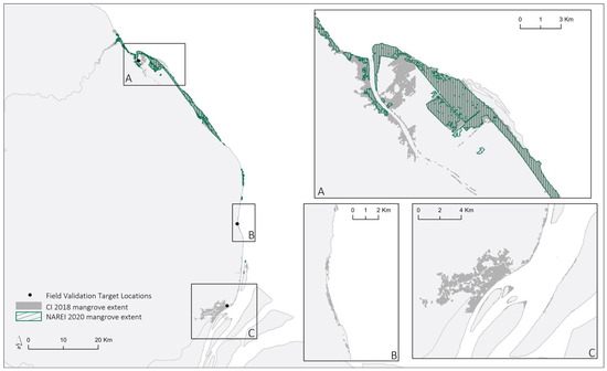 Target Sites for mangrove distribution validation and change detection. EAME 2018 mangrove baseline and 2020 data fusion and target sites identified for further field validation: (A) target site 1—Pomeroon Estuary, (B) target site 2—La Union Village, (C) target site 3—Supenaam Stelling.