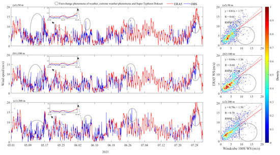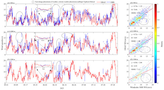 Time series (a1–f1) and scatter plots (a2–f2) of the observed horizontal wind speeds at various heights compared with the ERA5 reanalysis data values. The zoomed-in time series of 2 and 3 June 2023 were selected for comparison, with the red and blue lines representing the horizontal wind speeds from ERA5 and Doppler wind lidar, respectively. The areas circled by ellipses are the locations of wind speed changes during extreme weather and heavy rainfalls.