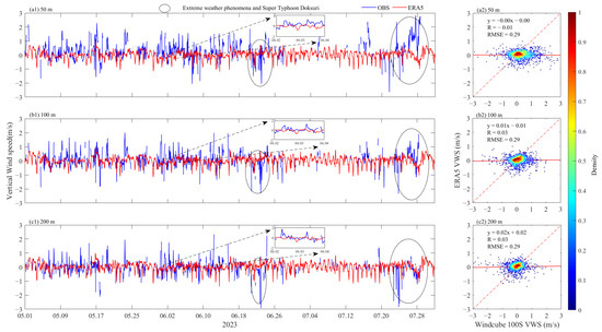 Same as Figure 2, but for vertical wind speeds at different heights. Time series (a1–f1) and scatter plots (a2–f2) of the observed vertical wind speeds at various heights compared with the ERA5 reanalysis data values. The zoomed-in time series of 2 and 3 June 2023 were selected for comparison, with the red and blue lines representing the vertical wind speeds from ERA5 and Doppler wind lidar, respectively. The areas circled by ellipses are the locations of vertical wind speed changes during extreme weather.