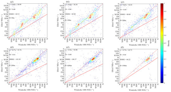 (a1–f1) Wind rose plots of mean wind speed observations in 16 directions at each height compared to the ERA5 reanalysis data; (a2–f2) scatter plots of wind direction observations at each height compared to the ERA5 wind directions.