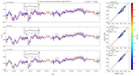 Same as Figure 2, but for the temperature at different heights. Time series (a1–i1) and scatter plots (a2–i2) of the observed temperature at various heights compared with the ERA5 reanalysis data values. The zoomed-in time series of 2 and 3 June 2023 were selected for comparison, with the red and blue lines representing the temperature from ERA5 and MWR, respectively. The areas circled by ellipses are the locations of temperature changes during extreme weather.