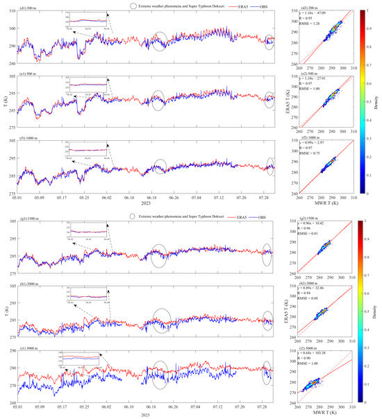In Figure 5(a1–e1), the deviations of the ERA5 reanalysis data are generally higher than those of the MWR observations before 20 May, and lower than those of the MWR observations after 20 May, and the temperature of the ERA5 data is higher than that of the observed data on 28 July, when southeast China was affected by the typhoon. In Figure 5(f1,g1), the ERA5 reanalysis data and the observed temperatures from the MWR show a good agreement at 1000 m and 1500 m. Under the influence of the typhoon, the temperature observations after July 28 are lower than the ERA5 temperature data at altitudes other than 1000 and 1500 m, and the ERA5 data temperatures at altitudes of 1000 and 1500 m are less affected by the typhoon. A poor correlation between the ERA5 reanalysis data and the observations are found at 2000 m and 3000 m. The systematic deviation is 2 K at 2000 m and more than 5 K at 3000 m. In Figure 5(h2,i2), the scatter plot reveals a discrepancy between the actual data points and the red dotted line, as the fitted line exhibits a considerable displacement from its corresponding reference line. However, the temperature trend of the ERA5 reanalysis data is improved in Figure 5(h1,i1), and the error only occurs in special weather conditions. The temperature of ERA5 reanalysis data are well correlated in the middle and bottom layers over mountainous areas. However, in the upper layers above 2000 m, there is a phenomenon whereby the higher the altitude, the larger the deviation. These large temperature deviations at higher altitudes have been mentioned in previous studies [13]. The accuracy of the ERA5 reanalysis data itself is also insufficient, and although the resolution has reached 0.25° × 0.25°, the accuracy of 31 km also makes it unable to precisely describe the exact meteorological elements at a location. We also compare the observations with the ERA5 data through the U,V component of the wind, as detailed in Figure S7.