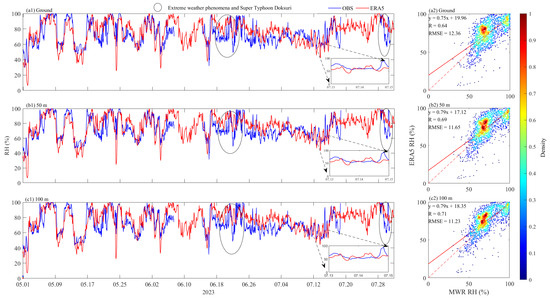 Same as Figure 2, but for the relative humidity (RH) at different heights. Time series (a1–i1) and scatter plots (a2–i2) of the observed relative humidity at various heights compared with the ERA5 reanalysis data values. The zoomed-in time series of 13 and 15 July 2023 were selected for comparison, with the red and blue lines representing the relative humidity from ERA5 and MWR, respectively. The areas circled by ellipses are the locations of relative humidity changes during extreme weather.