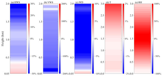 Figure 7 shows the mean deviations of ERA5 and remote-sensing observations for different meteorological variables. In Figure 7a, the horizontal wind speed of the ERA5 reanalysis data is positively deviated at a maximum of 9% when presented below 400 m. Above 400 m, there is a tendency of an increasing negative deviation, and a large deviation of the horizontal wind speed at upper levels will generate larger errors in the operation of the climate models. The ERA5 vertical wind speed shows a more obvious negative deviation below 1800 m, which indicates that the ERA5 reanalysis data are unable to accurately represent the state of the local vertical motions (Figure 7b). Some of the poor agreement between the model and observations for the vertical velocities can be attributed to differences in the averaging timescales used for the wind lidar and the ERA5. Wind radar observations have a second resolution. We compared their averaged hourly data to the ERA5 data at an hourly resolution, and a large error was found. Figure 7c shows that the deviation of the ERA5 wind direction varies within 10%. Affected by the local circulations and the terrain forcings, it is normal to fluctuate the small deviations. In Figure 7d, although the deviation shown is only within 2%, we observed higher temperature deviations at higher altitudes occurs above 2000 m. The humidity data from the ERA5 reanalysis datasets show more pronounced positive deviations from 500 to 2500 m, as shown in Figure 7e, with that of the ERA5 data, which is twice as high as the observed values.