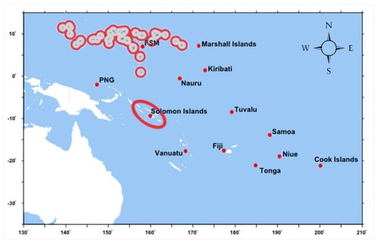 Study region. The red circles show the islands of the two countries under study. Source: Pacific Sea Level Monitoring Project (http://www.bom.gov.au/pacific/projects/pslm/index.shtml, accessed on 15 May 2023, modified to show details of FSM).
