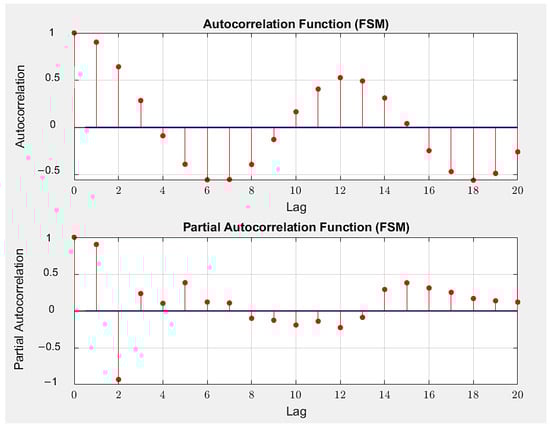 Lags are an important aspect of time-series data modelling []. To determine significant lags, the Auto-Correlation Function (ACF) and Partial Auto-Correlation Function (PACF) were computed, which take into account seasonal and cyclic trends and residuals to find correlations []. Figure 2 shows the results of this analysis for the FSM.