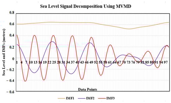 Signal decomposition is the extraction and separation of signal components into their intrinsic mode functions (IMFs) []. Multivariate Variational Mode Decomposition (MVMD) was used, which has the ability to simultaneously capture the non-stationary and non-linearity of a multichannel signal to overcome mode-mixing issues []. This procedure helps extract hidden features from the sea level time-series signal and facilitate effective AI model learning from these input variables for accuracy in forecasting. Figure 3 shows the sea level signal decomposition using MVMD for the FSM.