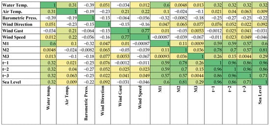 Solomon Islands correlation matrix showing the correlation between the sea level and all predictor variables. The dark green areas show a strong correlation, yellow areas show weaker correlation and white cells show negative correlation. (t − 1), (t − 2), (t − 3)—are lags for 1, 2 and 3 years, respectively. M1, M2 amd M3 are IMF1, IM2 and IM3, respectively.