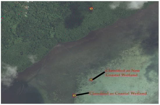 NDVI values can range between −1 and +1, with positive values representing vegetation of varying health and negative values representing other land use/land cover (LULC) classes []. A total of 330 samples were taken for the Solomon Islands and 340 for the FSM. These samples were then split into training (80%) and testing (20%) sets. The model used 200 trees and 5 randomly selected predictors per split. Each stratified point was checked with ground-based images, as shown in Figure 5, to evaluate the label for correct classification of the coastal wetland.