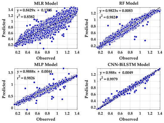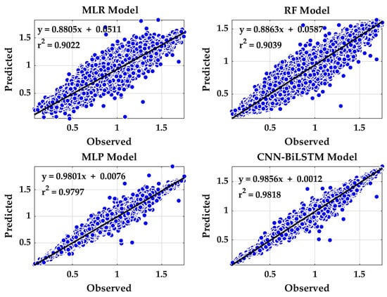 Table 4 shows the model performance metrics for the FSM, with the CNN-BiLSTM model once again achieving a superior performance across all metrics. The RF and MLP models were again similar in terms of both efficiency and error, while the MLR model performed the worst across all measures once more.