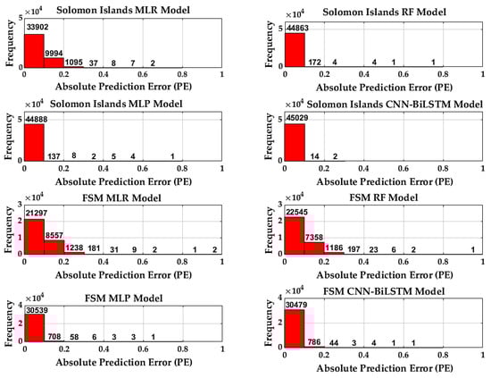 Histograms are another effective graphical method of indicating the predictive performance of models, showing the frequency of prediction error (PE) and its distribution within the partitioned “bins”. Figure 9 depicts histograms of the absolute PE of each model for both the Solomon Islands and FSM.