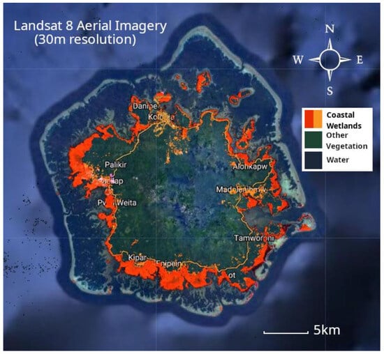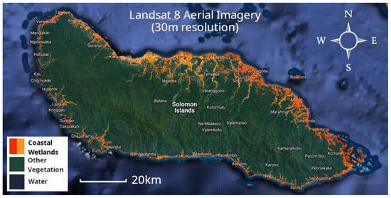 Small island developing states (SIDS), including those in the Pacific, are disproportionally threatened by climate change []. Pacific Island countries and territories, including the Federated States of Micronesia (FSM) and the Solomon Islands, depicted in Figure 1, are often described as being on the “frontline”, with increases in global average temperature predicted to not only increase the intensity and frequency of disaster events [] but to lead to sea level rise. This, in turn, will exacerbate coastal erosion [], impacting valuable ecosystems, including wetlands. Recent developments in both Earth observation methods, including the satellite and geodetic data obtained via remote sensing (RS), and artificial intelligence (AI) have increased opportunities for not only rapid, accurate assessment of sea level, coastlines and vegetation but also for researchers to make predictions about how they will change, allowing communities and policymakers to better respond to climate threats.