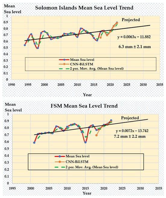 This study utilised data-driven AI models to predict the sea level using a range of climate input variables. It successfully used TG data to predict the sea level in the Solomon Islands and FSM from 1994 to 2022. The geodetic variables of water, air temperature, barometric pressure, wind direction, gust and speed were used to train the AI models. The hybrid CNN-BiLSTM model provided the most accurate sea level prediction for both study sites. The mean sea level was used to provide an annual trend analysis, which revealed a projected increase for both locations above the global trends. The mean sea levels were found to have risen 6.0 mm/year over the last two decades in the Solomon Islands (a slight decrease compared to the 6.3 ± 2.1 mm/year rate of rise since 1994) and 7.2 ± 2.2 mm/year in the FSM. The SLR in both locations appears significantly higher than the global averages.