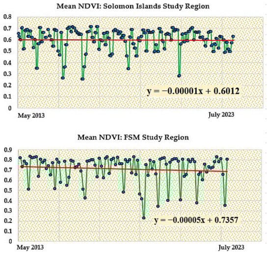 The identification of wetlands in general in small island nations such as the FSM and Solomon Islands can be difficult, with challenges including the availability of cloud-free scenes and the detection of small, yet ecologically significant, patches of vegetation. The detection of coastal vegetation changes was carried out using data from Landsat satellite images and an RF model to examine the coastal wetlands on Guadalcanal and Pohnpei and data from GMW to examine mangrove trends in the Solomon Islands and FSM more broadly. A high level of accuracy (>0.98) was achieved using the RF model at both study sites. The coastal wetlands in general were found to have decreased in extent. Analysis of vegetation health is of particular importance in the Solomon Islands given the detrimental effects of logging observed by Minter and van der Ploeg []. The mean NDVI in the Pohnpei region in the FSM (ranging between 0.4 and 0.8) was found to be higher than in the Guadalcanal region in the Solomon Islands (ranging between 0.3 and 0.7), consistent with the other results of the present study. Apparent losses in wetlands were recorded in both study areas using the Landsat satellite imagery analysis, while such decreases may be associated with logging and other climate change effects, including a rising sea level.