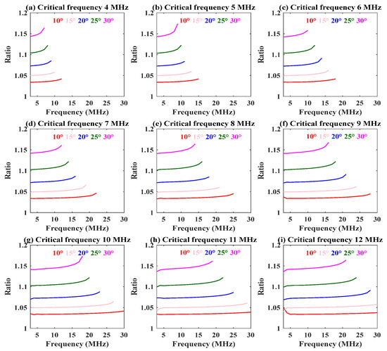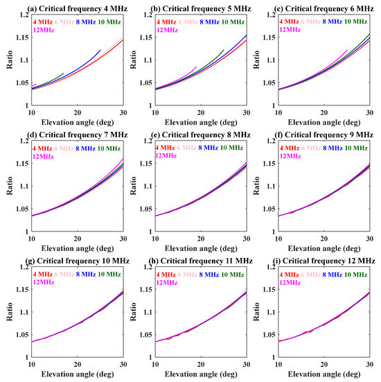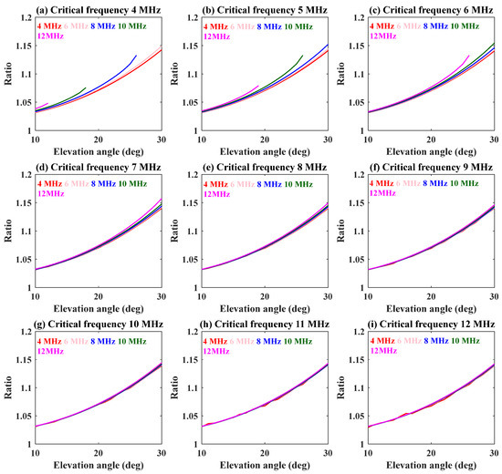 Variation in numerical ratio with the elevation angle at different frequencies. Each panel shows the trends calculated at different critical frequencies (4–12 MHz; the step size is 1 MHz).