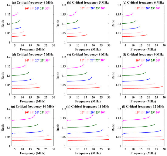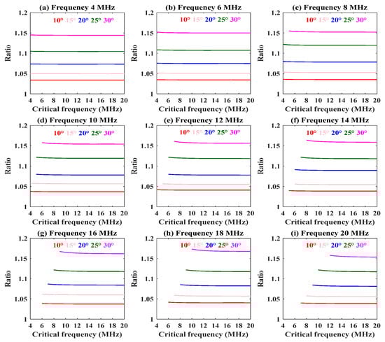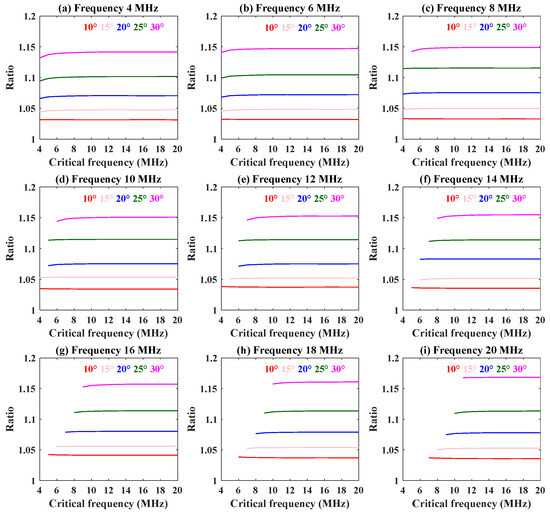 The variation in the numerical ratio with radio frequency at different elevation angles (10°–30°) and critical frequencies (4–12 MHz) is shown in Figure 2. The step sizes of the elevation angle and critical frequency are 5° and 1 MHz, respectively. This reveals that the radio frequency has little effect on the numerical ratio. From Figure 3, we know that the numerical ratio hardly changes with the critical frequency. So the numerical ratio is also not influenced by the critical frequency. Combining Figure 2 and Figure 3, we can see that the larger the elevation angle, the greater the numerical ratio.
