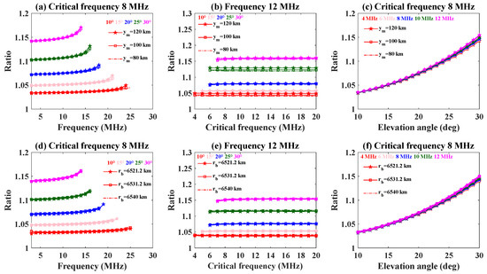 However, from Equation (7), the electron density of the background ionosphere is related to the base height and semi-thickness. Variations in these parameters can affect the propagation path of radio waves. The trends of the numerical ratio with the frequency, critical frequency, and elevation angle at a base height of 6521.2 km are separately shown in Figure 5, Figure 6 and Figure 7. Finally, the conclusions are the same as above.