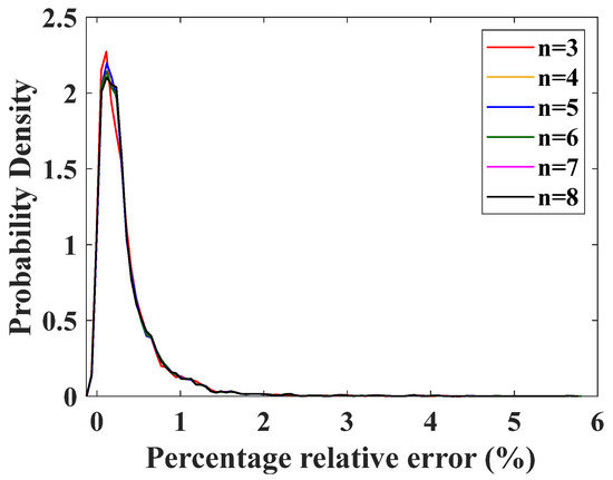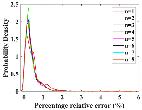 where is the elevation angle, is the coefficient of the polynomial, is the order of the polynomial, and is a constant term. It is worth underscoring that the addition of higher-order terms can make this equation complicated. Accordingly, the maximum value of the order is considered to be 8. All data in Figure 2, Figure 3 and Figure 4 are taken as samples and substituted into Equation (9) in turn. The probability density distribution curves of the relative error between the fitted values and actual simulation values for different orders under varying elevation angles are shown in Figure 9. While the order is greater than 2, the density distributions are similar.