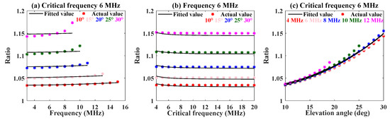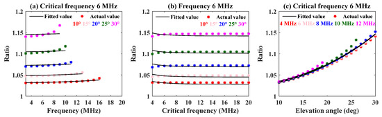 Figure 11 shows that the fitted values derived from the current coefficients and the actual simulation values are almost consistent under different conditions of frequencies, critical frequencies, and elevation angles. In this case, the maximum and minimum relative errors among the fitted values and actual values are 5.66% and %, respectively. Similarly, all data obtained under another background ionospheric model (Figure 5, Figure 6 and Figure 7, km and km) are substituted into Equation (11). The corresponding coefficients are = 2.043217, = −0.851211, = 0.1754, = 0.112767, = , and = −0.353716. Certainly, the fitted values and actual values can be given as shown in Figure 12. In this scenario, the maximum and minimum relative errors are, respectively, 5.2138% and %. The above results indicate that it is feasible to use Equation (11) to depict the mapping correlation between the numerical ratio and the three factors (frequency, critical frequency, and elevation angle) under different background ionospheric models.
