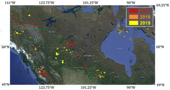 Considering the data availability of Sentinel-1/2, the 2017–2019 Canadian wildfires were taken as the main study areas/period (see Figure 1). The NBAC products include fire location, fire period, and accurate burned area polygons, which are quite valuable in wildfire monitoring for both remote sensing and the machine learning community. To accelerate the research on deep learning for wildfire monitoring, we created a large-scale optical and SAR satellite imagery dataset of 20 m spatial resolution based on freely available satellite data, such as Sentinel-2 multispectral instrument (MSI) data, Sentinel-1 C-Band SAR data, and ALOS PALSAR/PALSAR-2 L-Band SAR data.