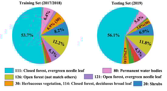 Figure 3 shows the land cover distribution of the proposed data in training and testing sets. The dominant land cover type is the closed forest with evergreen needle leaf in both training and testing sets, while open forest (class values: 121, 126) occupies about 18.5% in the training set and 16.1% in the testing set. In total, 8.2% of land cover is shrubs in the training set and 6.9% in the testing set, and the remaining main land cover includes permanent water bodies, herbaceous vegetation, and closed forest with deciduous broad leaf.