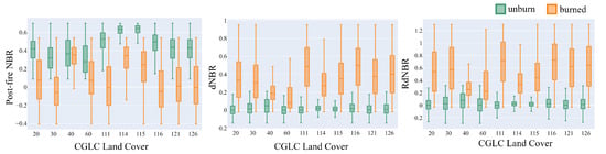 Figure 4 shows the difference between healthy and burned vegetation in post-fire NBR, dNBR, and RdNBR with respect to land cover types, where , , and . It is worth noting that both the unburned and burned pixels were randomly sampled based on the reference mask. (1) For different land cover types, the burned vegetation has significantly wider spreads and longer boxes than healthy vegetation in the post-fire NBR, dNBR, and RdNBR; (2) the dNBR median value of healthy vegetation is close to 0, while that of burned vegetation is higher than 0.3 expect for the agriculture (CGLC: 40) and sparse vegetation areas (CGLC: 60); (3) most of land cover types follow a normal distribution in dNBR and RdNBR before and after wildfire burning, and there is no significant difference in the distribution of dNBR and RdNBR. (4) The closed forests (including deciduous broad leaf and mixed, CGLC: 114 and 115) show a higher post-fire NBR than other land cover in unburned areas.