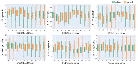 As shown in the bottom row in Figure 6, from the log-ratio differenced backscatter charts, we observed that (1) in unburned areas, the log-ratio differenced ND, VH, and VV backscatters follow a normal distribution with a median value close to zero; (2) for the log-ratio differenced VH, burned areas have a significantly higher box and median value than unburn areas in various land cover types, while the log-ratio differenced VV shows significant difference in CGLC-30, 40, 114, and 115 between unburn and burned areas; (3) the log-ratio differenced ND also shows a clear difference in distribution between unburned and burned areas.