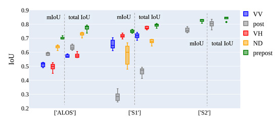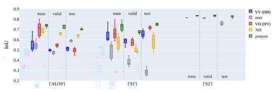 Figure 9 shows the performance comparison of U-Net on S1, ALOS, and S2 data with various input channels. It is observed that (1) for S2, the prepost setting achieved a slightly higher IoU score than post image alone, and different runs have a relatively low IoU variance in both training and validation sets. Compared to the validation set, the post setting shows a 0.05 decrease in IoU score on the testing set while prepost shows almost no decreases in IoU with a slightly larger variance. (2) For S1, the prepost setting achieved the highest IoU score while the post setting obtained the lowest IoU score across the training, validation, and testing sets. Bi-temporal stacked VH achieved the highest IoU score, followed by VV and ND. Except for the post setting, all other settings achieved higher IoU scores in the testing set than the validation set, which may imply that the model trained only with post-fire images has poor generalization performance. (3) For ALOS, the prepost setting achieved the highest IoU score across the training, validation, and testing set, followed by the ND setting. The VH setting achieved significantly higher IoU than the VV setting in both training and validation sets but not in the testing set. The post setting achieved a 0.1 higher IoU score in the testing set than the validation set, which is quite different from the observations on the S1 data. (4) Except for the VH and VV setting, ALOS-based results have a smaller box than S1-based ones. For both ALOS and S1, the prepost setting achieved the highest IoU score. For ALOS, the performance ranking is prepost > ND > HV > post > HH, while for S1, the performance ranking is prepost > VH > VV > ND > post.