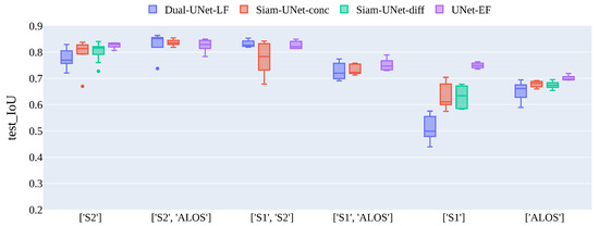Figure 10 shows the quantitative comparison among four classical change detection architectures based on bi-temporal data acquired by a single sensor or any two sensors from Sentinel-2, Sentinel-1 and ALOS-2 PALSAR-2. (1) For a single sensor, whether it is S2, S1, or ALOS, U-Net achieved the highest IoU score with the smallest box, followed by the two Siamese U-Net, and the DuelUnet_LF obtained the lowest IoU score with a relatively larger box. For S2 and ALOS, U-Net achieved slightly higher accuracy than these two Siamese U-Net with concatenated or differenced features, which also performed slightly better than the DuelUnet_LF. But for S1, we observed that U-Net achieved a 0.1 higher IoU than these two Siamese U-Nets and 0.25 higher IoU than the DuelUnet_LF. No significant difference was observed between SiamUnet_conc and SiamUnet_diff on the proposed wildfire dataset. (2) For the multi-sensor fusion settings, we fed different sources of data into two branch subnetworks of SiamUnet_conc and DualUnet_LF. There is no SiamUnet_diff anymore because it is not meaningful to differentiate the features from different sensors. We investigated the fusion performance by fusing any two of these three sensors, i.e., S2, S1, and ALOS. For the S2-ALOS fusion and the S1-S2 fusion, all three architectures achieved almost the same accuracy except for the exceptional SiamUnet_conc in the S1-S2 fusion. For the S1-ALOS fusion, UNet performed slightly better than the other two. (3) From the cross-comparison among single- and multi-sensors, we observed that the S2-ALOS fusion and S1-S2 fusion performed slightly better than S2 itself and achieved significantly higher IoU than S1 or ALOS. The S1-ALOS multi-frequency fusion performed significantly better than S1 and ALOS, and U-Net achieved the highest accuracy in SAR-based results.