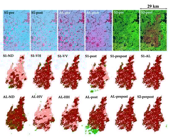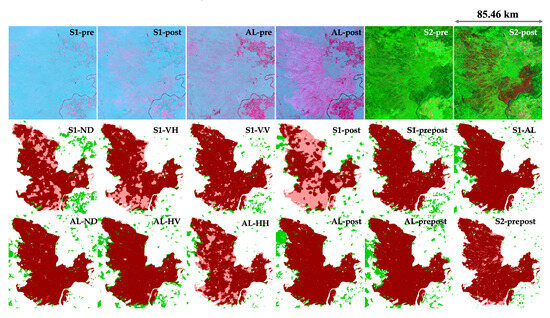 Figure 11, Figure 12, Figure 13 and Figure 14 show the visual comparison among 12 different settings on four wildfire events, i.e., CA-2019-NT-8, CA-2019-AB-172, CA-2019-QC-808, and CA-2019-ON-730. From Figure 11, we observed that (1) both Sentinel-2 and Sentinel-1 post-event images show the burned area quite clearly, and ALOS PALSAR post images also show the detectability of the burned area, but its visibility is not as good as the other two; (2) all pre-event images from these three sensors look good visually and show decent consistency in unburned areas between pre- and post-event images; (3) Sentinel-2 achieved the best visual results on the CA-2019-NT-8 wildfire, and AL-VH and AL-VV are the worst two. As for the CA-2019-AB-172 fire in Figure 12, we observed that (1) the ALOS PALSAR post-event image shows the best visibility of burned areas, while the burned area connectivity looks low visually in both Sentinel-2 and Sentinel-1 post-event images; (2) Sentinel-2 achieved the best visual results, and most results detected the burned areas correctly, while S1-post and S1-ND are among the worst ones. As shown in Figure 13, we observed S1-prepost, S1+ALOS, ALOS-prepost, and S1-VH achieved decent results on the CA-2019-QC-808 fire event, while S1-ND, S1-post, AL-ND, and AL-post are among the worst. On the CA-2019-ON-730 fire, we found most results show good consistency with the ground truth, but S1-ND and AL-VH are quite bad. Both S1-post and ALOS-post show a few FP pixels in the bottom left corner, and the FP pixels disappeared when the pre-event image was used.