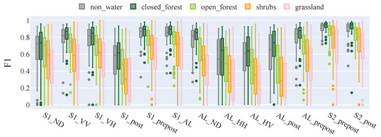 F1 boxplot of U-Net predictions on the 58 testing events with respect to various land cover types, such as non-water areas, closed forest, open forest, shrubs, and grassland (S1, AL, and S2 are short for Sentinel-1, ALOS-2 PALSAR-2, and Sentinel-2).