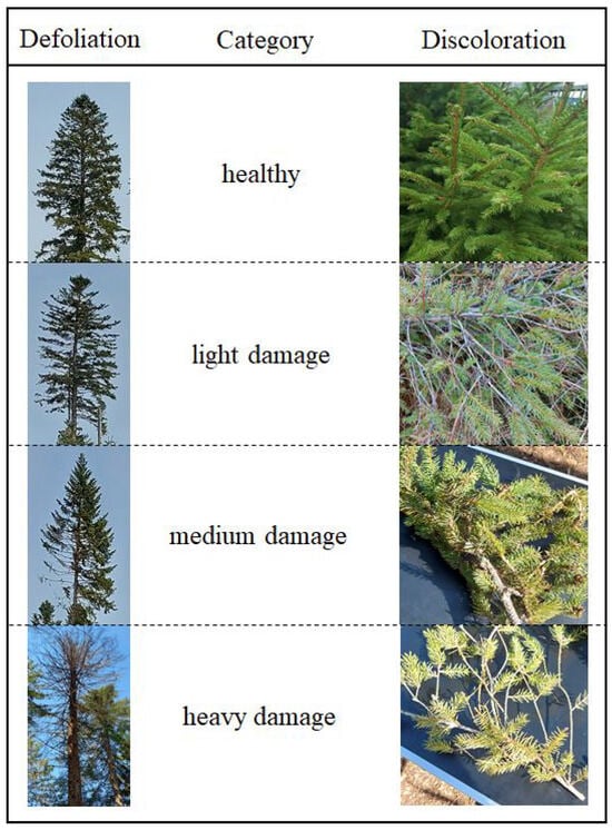 The study area comprises two regions in Germany: the Black Forest in the southwest of Baden-Wuerttemberg (F areas in Figure 2) and the Harz region, also including one forest area near Göttingen in Lower Saxony (G areas in Figure 2). Each area comprises several forest plots where the data were collected. Data collection took place throughout the year, and more than 30 vitality and stem wood quality parameters were recorded. For this study, the overall crown vitality classification was used as dependent variable. The main vitality loss factor was drought-induced defoliation, while drought-induced discoloration of leaves or needles also occurred. Bark beetle infestation on the stem was associated with the two main drought stress symptoms, but the evaluation of stem parameters was not the subject of this study. The crown vitality classification consisted of a combined assessment of both main crown vitality loss factors and resulted in the definition of four distinct crown vitality categories: healthy, light, medium, and heavy damage (Figure 3). With one of the two factors being described as “light”, the resulting overall class is light damage, with both factors being positive, the assigned class is “medium damage”. The same decision rule was used to assign the “heavy damage” class. Two staff members were intensively trained on the task and double-checked among each other to achieve repeatable assessment results. The UAV flight campaign in the Harz area was conducted during the same week as the ground assessment because of rapidly advancing forest vitality loss that did not allow for a delay. The Black Forest stands were more stable, and the time lag between ground survey and drone flight was one to three weeks. Only stands with early damage symptoms were investigated in this study in order to assess the potential of early forest stand stabilizing measures according to the legally binding principles of integrated plant protection. Thus, no conifer tree showing the yellow or even red crown stage, which is the intense discoloration that appears weeks to a month after a bark beetle infestation, was included in the study. However, the spruce trees in the Harz region especially showed drought-induced needle loss at crown level and bark beetle infestation at stem level. All plots included in the study are shown at the same scale in Figure 2 and are labeled as F101, F102, F103, and F301 (Black Forest area) and G006, G001, G004, and G005 for Göttingen and the Harz region, respecively. All sampled trees are listed in Table 1.