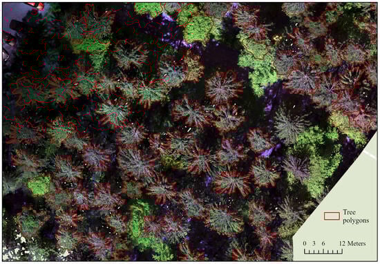 In the first step, orthophotos for the individual forest areas were generated from the UAV flight images using the software Agisoft Metashape (Agisoft LCC, St. Petersburg, Russia). The workflow comprised alignment, dense cloud generation, DEM generation, and orthophoto generation. The respective parameters were optimized in previous trials. An example of an orthophoto with corresponding labels is shown in Figure 4. The images were exported as GEO-TIF files and contained spectral information from the five or six bands, depending on the camera. Only the first five bands were taken into account in this study, as images from both cameras were to be processed together, and the models can only learn to generalize from comparable camera settings. The correct crown extent for each tree collected using our mobile application was then manually digitized in ArcGIS Pro to create accurate and high-quality training data. In total, 1473 single-tree segments were generated for the eight plots (see Table 1).