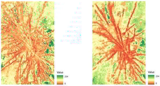 To evaluate how well different degrees of damage and different tree types (decidious vs. coniferous) can be classified, we created three different datasets, exported corresponding tiles and labels for each set, and conducted extensive preprocessing (compare Table 3). The tiles were created from the orthopotos and converted into Python arrays for deep learning. As this is done by converting pixel values into cells of a Python array, the different spatial resolution does not pose a problem, but will provide more variability to the algorithm to better learn spatial features at slightly different scales. This also corresponds well to the practical requirements in the field, where a robust analysis towards different resolutions is needed, because tree heights can differ in one stand, and slopes will always have an effect on the GSD in the orthophotos. (1) The first dataset was for binary classification between damaged and healthy trees, without consideration of degree of damage or tree species. (2) For a second experiment, we created a dataset with three classes to reflect the degree of damage: light, heavy, or no damage. (3) For our final experiment, we created four classes with coniferous (healthy/damaged) and deciduous (healthy/damaged) trees. To create the datasets, we used the “Export Training Data for Deep Learning” tool in ArcGIS Pro (ESRI, California, United States) with the following parameters: a tile size of 512 × 512, a stride of 256, the ImageNet metadata format, and the Bounding Box option. Further preprocessing was conducted using Python in a Jupyter Notebook environment. Data were first split into training, validation, and test data (70, 20, and 10 percent, respectively). As the classes were unevenly distributed, this could have led to poor modeling results (e.g., [45]). To avoid this problem, we performed geometric data augmentation on the underrepresented classes: Images from the training dataset were randomly rotated 90, 180, or 270 degrees and also flipped horizontally to acquire a more balanced dataset. All data were normalized, and additional vegetation indices (NDVI, NDVIre) were calculated to test whether models performed well using vegetation indices instead of raw data (compare Equations (1) and (2)). Figure 5 shows an NDVI image (a) and an NDVIre image (b) for a damaged tree sample.