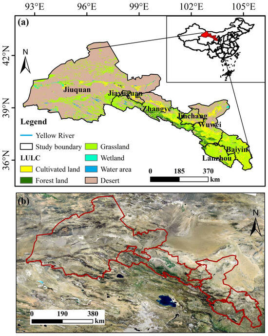 HXR (36°46′–42°49′N, 92°44′–104°14′E) is located in northwestern China (Figure 1). The region encompasses various ecosystem categories, including cultivated lands, forests, grasslands, wetlands, glaciers, snow-covered areas, and deserts [42]. HXR experiences a temperate continental climate characterized by limited precipitation, high evaporation rates, hot and dry summers, and cold and freezing winters [43]. The average precipitation, evaporation, and temperature are 178 mm, 2500 mm, and 12–13 °C, respectively [44]. The vegetation types mainly include xerophytic herbs and shrubland [41]. Despite having three inland rivers in the region (Shiyang, Heihe, and Shule rivers), water resources remain scarce [36,41,45,46]. The specific administrative division of HXR includes 7 municipalities and prefectures: Lanzhou, Baiyin, Wuwei, Jinchang, Zhangye, Jiayuguan, and Jiuquan, covering an area of 2.81 × 105 km2. The primary LULC categories are desert, grassland, and cultivated land. The total population is approximately 10.27 million, with a gross domestic product (GDP) of about CNY 567.5 billion in this region by 2020 (CNY: RMB unit).