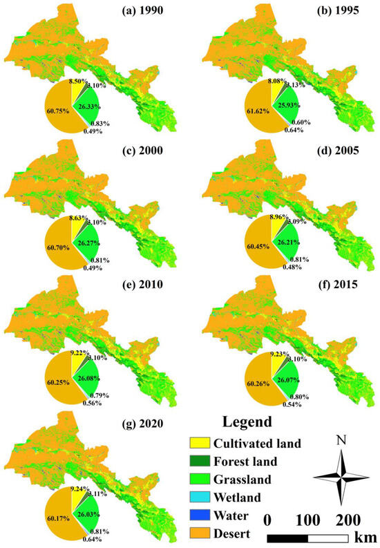 Spatio-temporal variations in LULC are closely linked to inter-annual variations in ESV. Figure 2 illustrates the spatial and temporal evolution of LULC from 1990 to 2020, revealing notable regional differences in the distribution within HXR. Compared to 1990, the cultivated land area slightly decreased from 1990 to 1995 but continued to grow until 2020 (increasing from 8.50% to 9.24% as a proportion of the total area). The forest and water areas exhibited a rising trend, with the forest area increasing by just 0.01% (i.e., 17 km2), while the water area expanded by 0.15% (i.e., 422 km2). Desert, grassland, and wetland areas decreased by 0.58%, 0.3%, and 0.02% (i.e., 1711 km2, 857 km2, and 40 km2) during 1990–2020, respectively (Figure 2). Notable regional disparities in the geographical distribution of LULC in HXR were identified. Forests, grasslands, water bodies, and wetlands are predominantly found in the mountainous areas located in the southwest, while cultivated land is primarily concentrated in the oasis areas. Deserts are widespread in the northern part of the region, collectively occupying over 95% of the total area (Figure 2).
