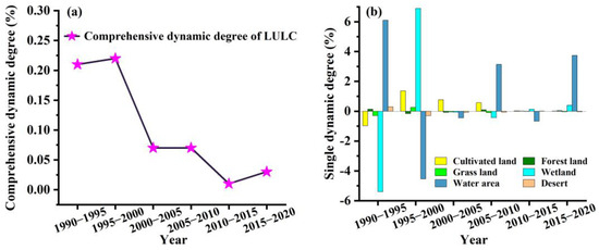 LULC dynamic degrees are utilized to indicate the change intensity in a particular LULC type. The comprehensive dynamic degree of LULC in HXR exhibited an overall decreasing trend (−0.18%) (Figure 3). It’s worth mentioning that the comprehensive dynamic degree increased from 2015 to 2020, indicating that LULC changes were in a relatively unstable state following the implementation of environmental preservation efforts in HXR (Figure 3a). The single dynamic degree showed different variation trends during 1990–2020 (Figure 3b). Specifically, the dynamic degree of forest, desert, and grassland declined, while the dynamic degree of wetland and water area increased. These findings suggest that climate change, particularly increased precipitation, contributed to the expansion of water bodies and wetlands in terms of their spatial extent.