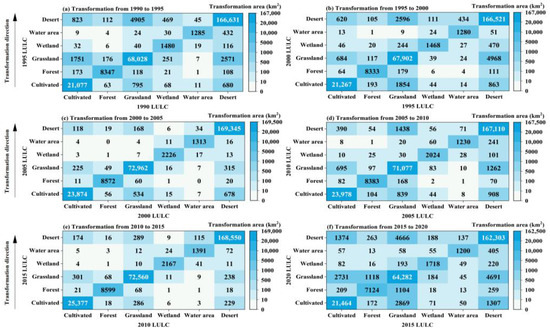 The transformation of LULC areas in HXR from 1990 to 2020 serves to characterize the direction of specific LULC changes. Grassland-desert transformation is the dominant mode of LULC change in the HXR and exists in most years (Figure 4). Additionally, transformations involving cultivated land and grassland also occur in certain years. In recent years, a shift from cultivated land to grassland has been observed, indicating the initial effectiveness of environmental preservation strategies and grassland recovery. The area of grassland-desert transformation is larger than the transformation between other LULC types, possibly influenced by climate change. In summary, climate change may have exacerbated LULC conversions in the region, but ecological protection strategies have contributed to positive developments in LULC conversions. In conclusion, the ecological environment of the HXR is generally improving, notably reflected in the reduction of desert area and the increase in water bodies and forests. However, hidden problems persist, such as the expansion of cultivated land encroaching on grassland and the transformation of grassland into desert.