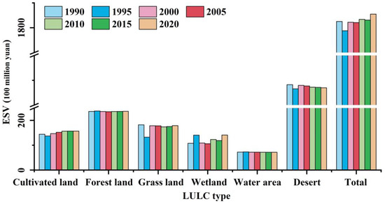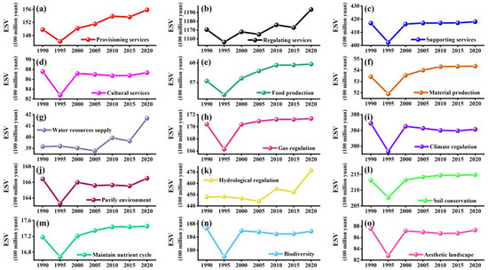 Temporal variation of ESV for the total and each LULC type in HXR during 1990–2020.
