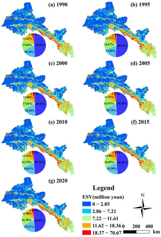 Geographical distribution of total ESV on a grid scale during 1990–2020. The pie chart represents the proportion of the area of ESV within each interval relative to the total area.