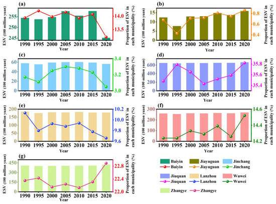 ESV variation for each administrative region and the proportion of ESV for each administrative region to the total ESV. subplots (a–g) represent the temporal variation of ESV in the municipalities of Baiyin, Jiayuguan, Jinchang, Jiuquan, Lanzhou, Wuwei, and Zhangye, respectively.