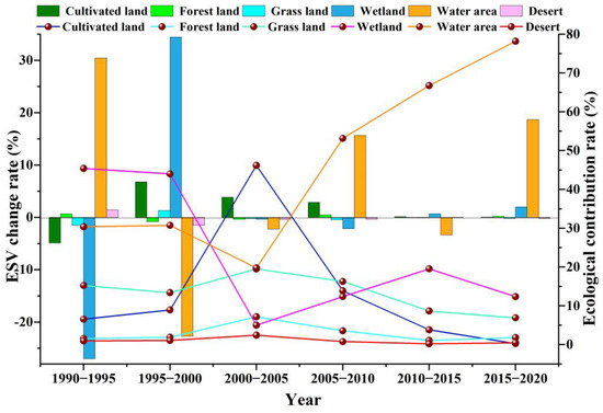 Frequent transformations of water bodies, cultivated land, grassland, and wetland have resulted in changes in ecological contribution rates (Figure 10). Notably, grassland, wetland, and water bodies have been the major contributors to ESV changes during most periods, with their combined contribution rate exceeding 80%. This indicates that water areas, grasslands, and wetlands are the primary drivers of ESV changes in the HXR over the past 30 years.