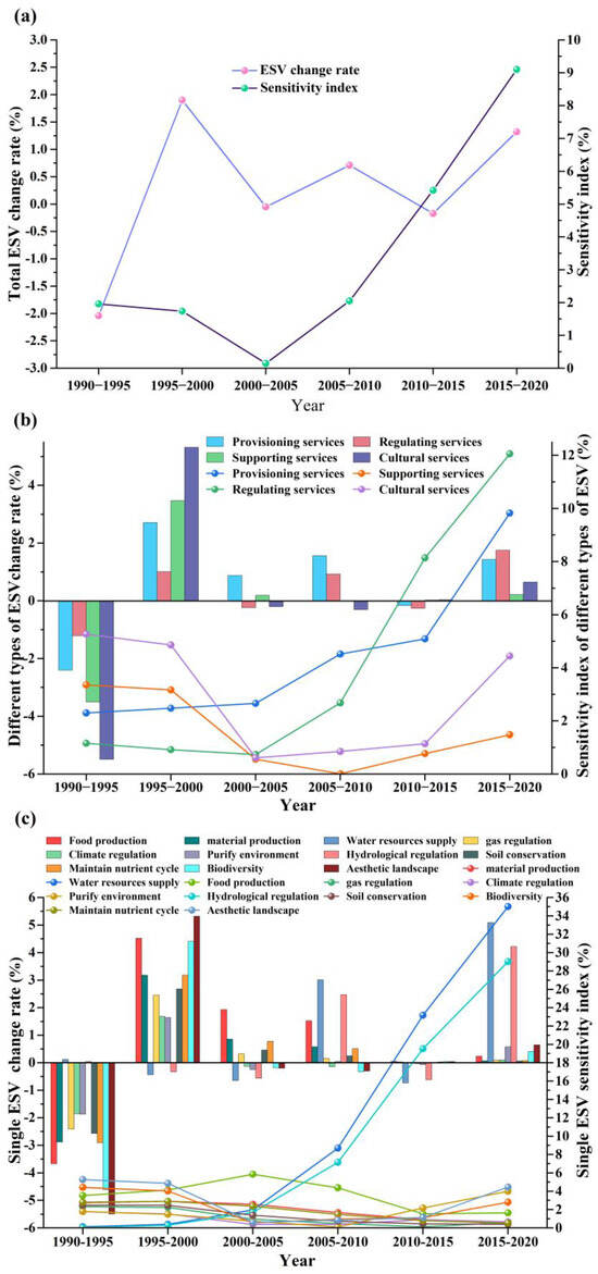 Change rate of ESV and its sensitivity to LULC changes. (a) is the total ESV change rate and its sensitivity to LULC variations, (b) is the dynamic rate of each ESV type and its sensitivity to LULC variations, and (c) is the dynamic rate of individual ESV and its sensitivity to LULC variations.