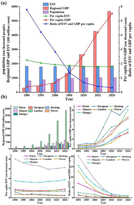 The temporal dynamic of GDP, ESV, population, per capita ESV/GDP, ratio of ESV and GDP per capita from 1990 to 2020. (a) is the change in these indicators over time across the entire HXR; (b) is the change in these indicators for each municipality.