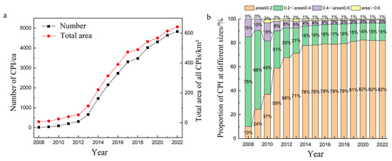 From 2008 to 2022, the number and area of CPI farmland units in the Mu Us region showed a continuous increasing trend and did not reach the peak (Figure 5a). The changes in CPI farmland unit number and area can be divided into three stages: (1) A slow growth period (2008–2012) from the first appearance in 2008 to 2012, where the number and total area of CPI farmland units were only 309 and 52.64 km2. (2) A rapid growth period (2013–2017) from 2013, where the number and total area of CPI farmland units increased rapidly, with 803 and 111.41 km2 added in 2014 alone, reaching 3306 and 472.83 km2 in 2017. (3) A decelerated growth period (2018–2022) from 2018, where the number and total area of CPI farmland units continued to increase but at a slower pace, with the lowest number and area added in 2018 being only 171 and 17.42 km2 and an average of about 400 and 30.44 km2 added annually from 2019 to 2022, reaching 4829 and 641.61 km2 in 2022 and possibly continuing the increasing trend.